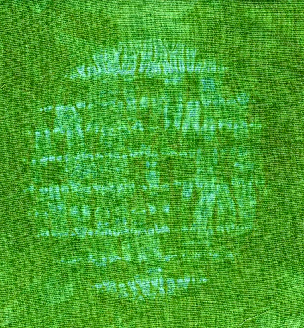 The fabric had been previously dyed with Lemon Yellow and Magenta and after stitching the fabric and drawing up the threads I dyed the fabric with Turquoise dye.