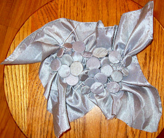 I finally had a chance to try this month’s technique. I didn’t have time to run out to get some marbles and cool polyester fabric, but I had some poly on hand from when we did a method where we actually “set fabrics on fire.” I used plastic buttons of varying sizes and tied them up in the polyester with crochet thread. Here is what it looked like when I had it tied up.