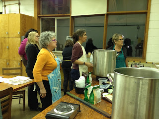 All eyes are on the board with the recipe for the 1-2-3 Indigo with Henna vat.  Sara Goodman is in the center with the purple shirt and white apron.  We made two big vats of indigo - one with fructose and one with henna.