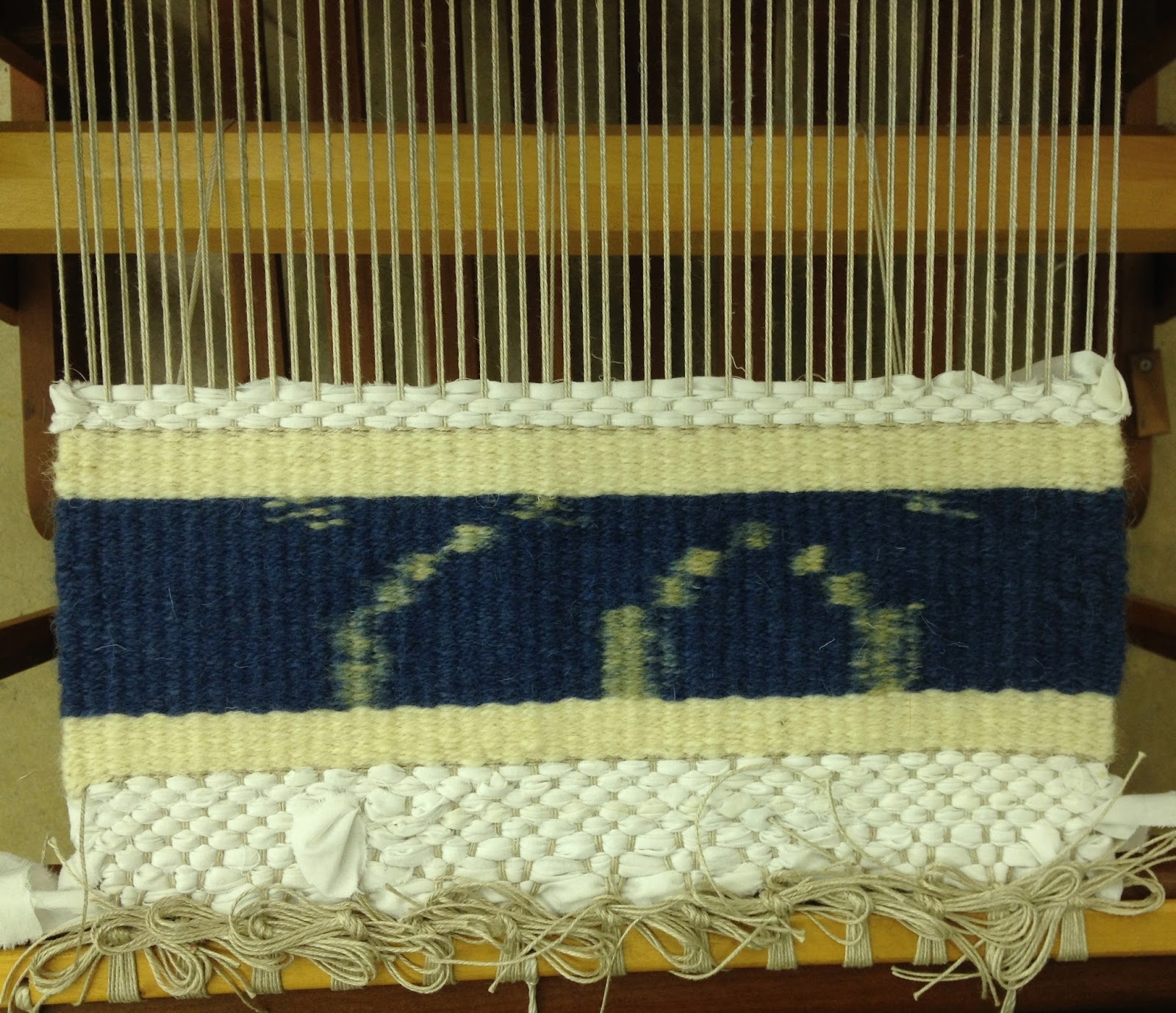 Below is my meager few inches of tapestry woven with white header on each side of the wool.  It was great to do this process from start to finish and understand all the steps involved in getting a design with the ikat process.