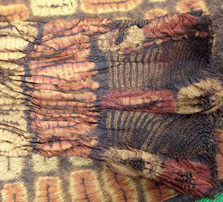 Not giving up on changing things with a dip in the indigo. I shibori stitched this scarf - which was in two different MX dye baths and still hadn't made the grade - and pulled it up very tightly. Put it in the pot and forgot about it.